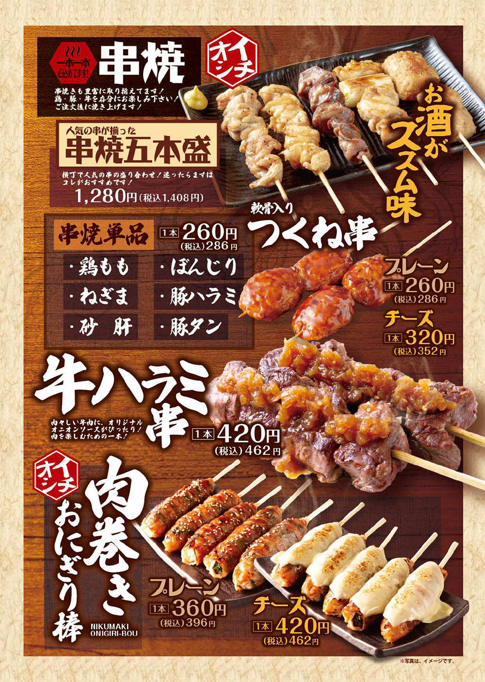 店長おすすめの串焼5本の盛合せ。おひとり様でもシェアでも是非お召し上がりいただきたい逸品です。
