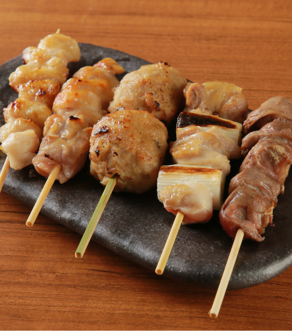 店長おすすめの串焼5本の盛合せ。おひとり様でもシェアでも是非お召し上がりいただきたい逸品です。